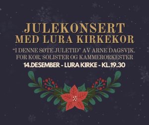Søndag 14. desember kl 19.30 inviterer vi til julekonsert me Lura kirkekor. Koret fremfører «I denne søte juletid» ac Arne Dagsvikm sammen med kammerorkester og solister. Billetter kjøpes HER