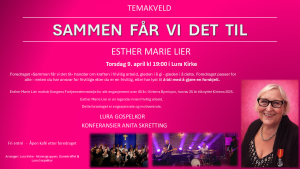 26. februar 202626. februar 2026Temakveld – Frivillighetav Torgrim BødalenTorsdag 9. april kl. 19.00 får vi besøk av Esther Marie Lier. Hun kommer med foredraget «Sammen får vi det til» som handler om kraften i frivillig arbeid. Lura gospelkor deltar også. Fri entré